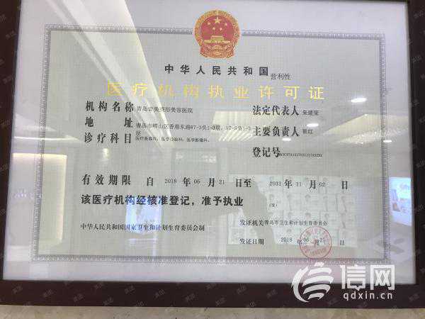信网经查询得知,壹美天成整形于2018年6月21日取得由青岛市卫生和计划生育委员会发放的医疗机构执业许可证,诊疗科目包括医疗美容科、医学检验科、医学影像科。
