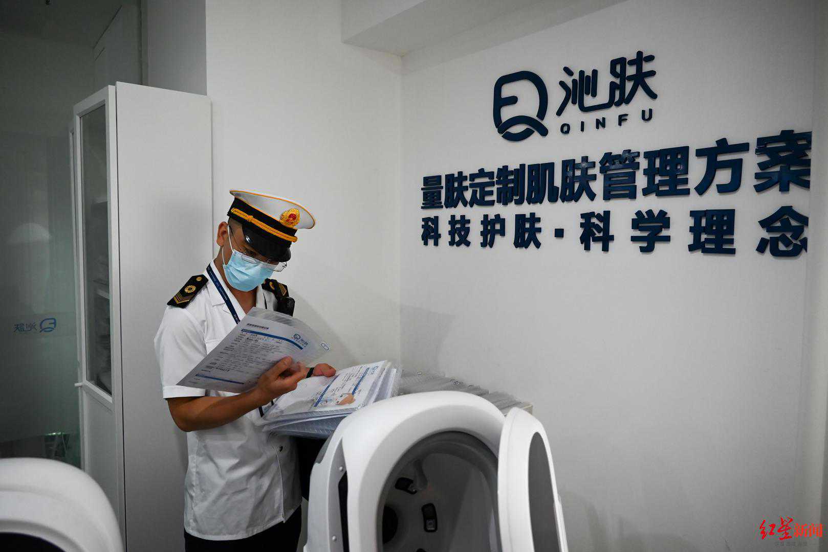 5月25日,红星新闻记者跟随其中一组执法人员,来到成都高新区天府二街附近一家名为“沁肤”的生活美容机构展开突击检查。
