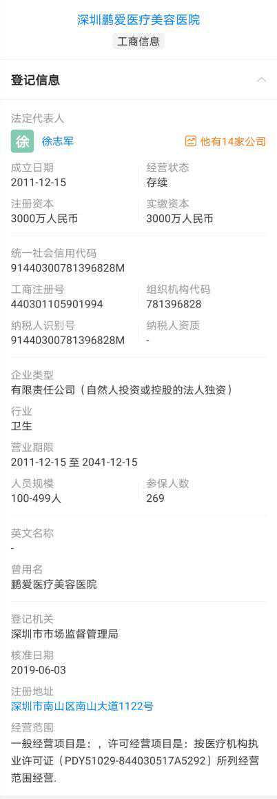 记者通过天眼查查询发现,深圳鹏爱医疗美容医院成立于2011年,隶属于鹏爱医疗美容集团。其大股东为深圳鹏爱医院投资管理有限公司。