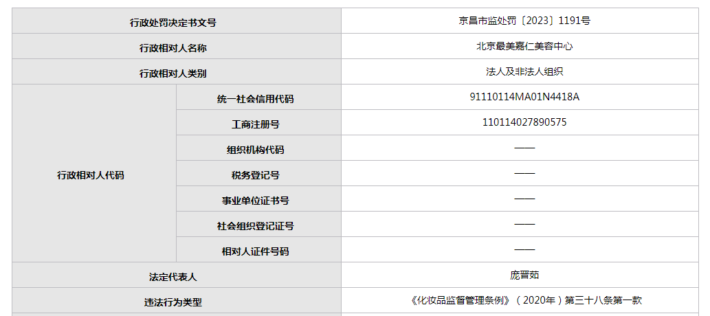 公开资料显示,北京最美嘉仁美容中心成立于2019年10月,注册资本50万人民币,法定代表人为庞晋茹。经营范围包括销售服装、化妆品、日用品、针纺织品、文化用品、体育用品、家用电器、电子产品;企业管理;设计、制作、代理、发布广告;承办展览展示活动;会议服务;包装装潢设计;模型设计;企业策划、设计(不含中介服务);销售机械设备;美容理发。天眼查平台显示,2020年10月,该美容中心未依照《企业信息公示暂行条例》第八条规定的期限公示年度报告,直至次年1月移出。