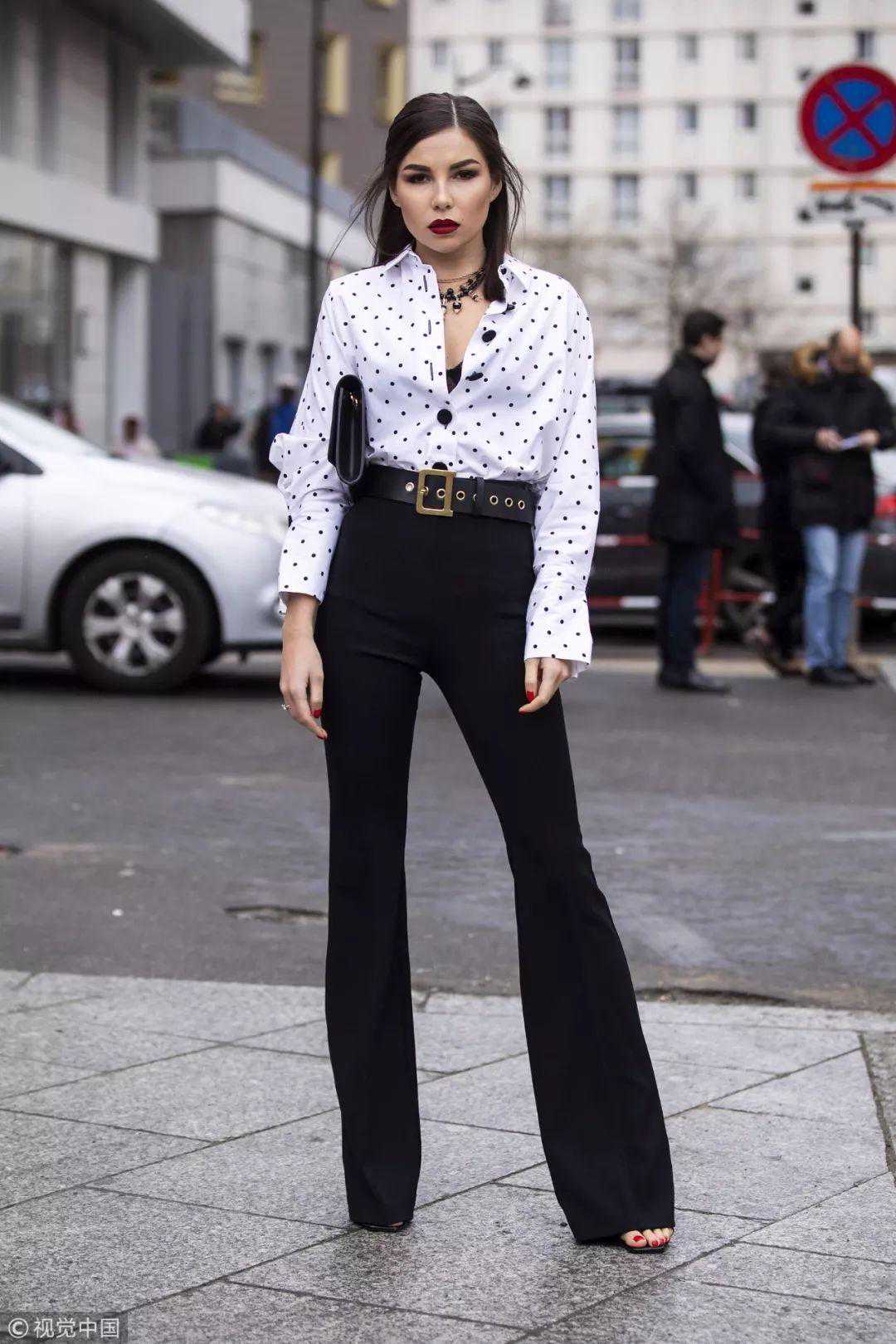 衬衫+长裤是典型的OL装束,波点衬衫也不例外。不难发现在裤型的选择中,潮人们集中选择了喇叭裤或阔腿裤,重点是:腰腹设计十分紧凑,不仅明确了腰线,上紧下宽的设计恰好收敛了衬衫的挺括性。