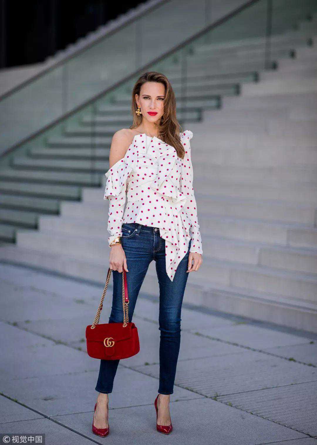 除了腰腹可以炫,优雅的天鹅颈和紧致的胳膊也可以露。斜肩波点衬衫正好可以满足你,甚至比短款波点衬衫更为知性迷人。