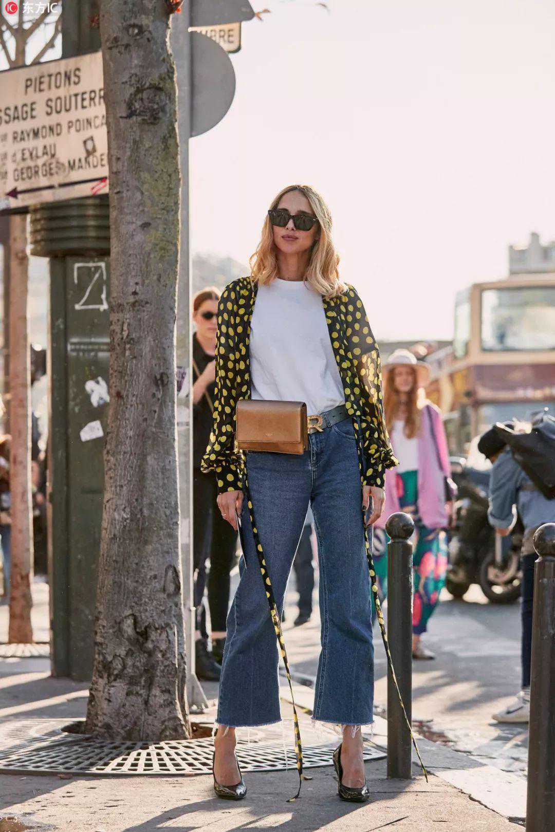 白T恤+牛仔裤造型十分常见,外搭黄黑波点衬衣气场立马不同,随风而动的飘带更灵动。
