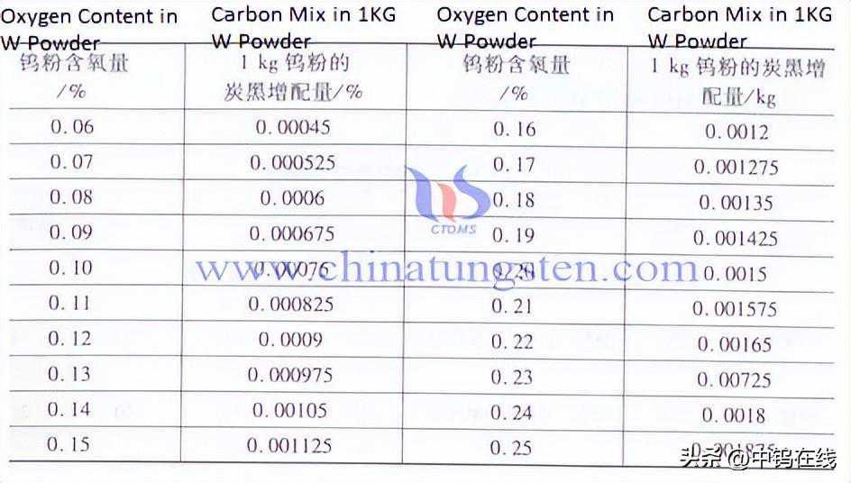 碳化钨粉使用的钨粉原料不同的氧含量需要不同量的炭黑增配量以达到碳化钨粉对总碳、化合碳、化合碳和游离碳的要求,下表是不同氧含量的钨粉生产碳化钨粉是需要的炭增配量。