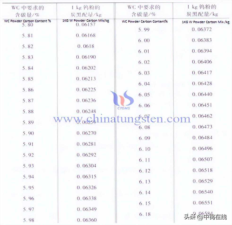 碳化钨粉的生产过程中,不同的总碳含量对应的配碳量是不同的,下表是对于统一规格的原料钨粉计算的不同总碳含量的千克炭黑配量比例表。