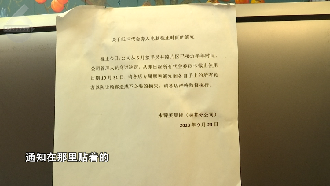 店员表示,去年5月公司就更换了老板,店名也做了更改,当时在前台处张贴了通知,告知顾客手上持有纸质卡片的,可以到前台录入电脑,可李大姐因为人在老家并不知情,以至于没有将手上的纸质卡片及时录入系统。不过,店员表示,李大姐之前在系统里的次数仍然有效,而没有录入系统的卡片将向领导反映并在一周内作出回复。