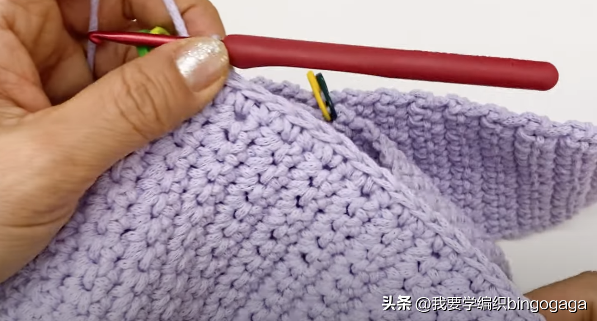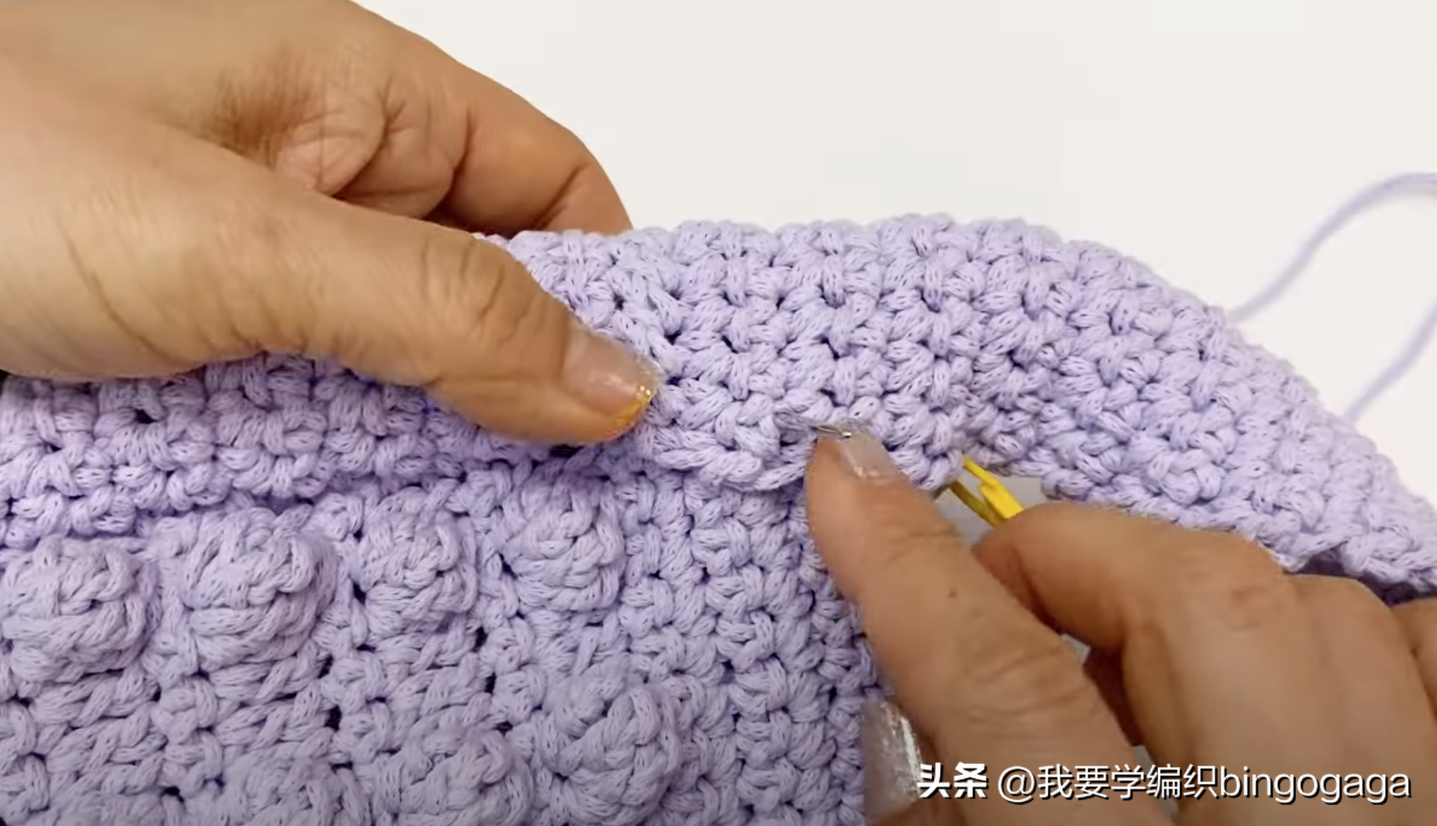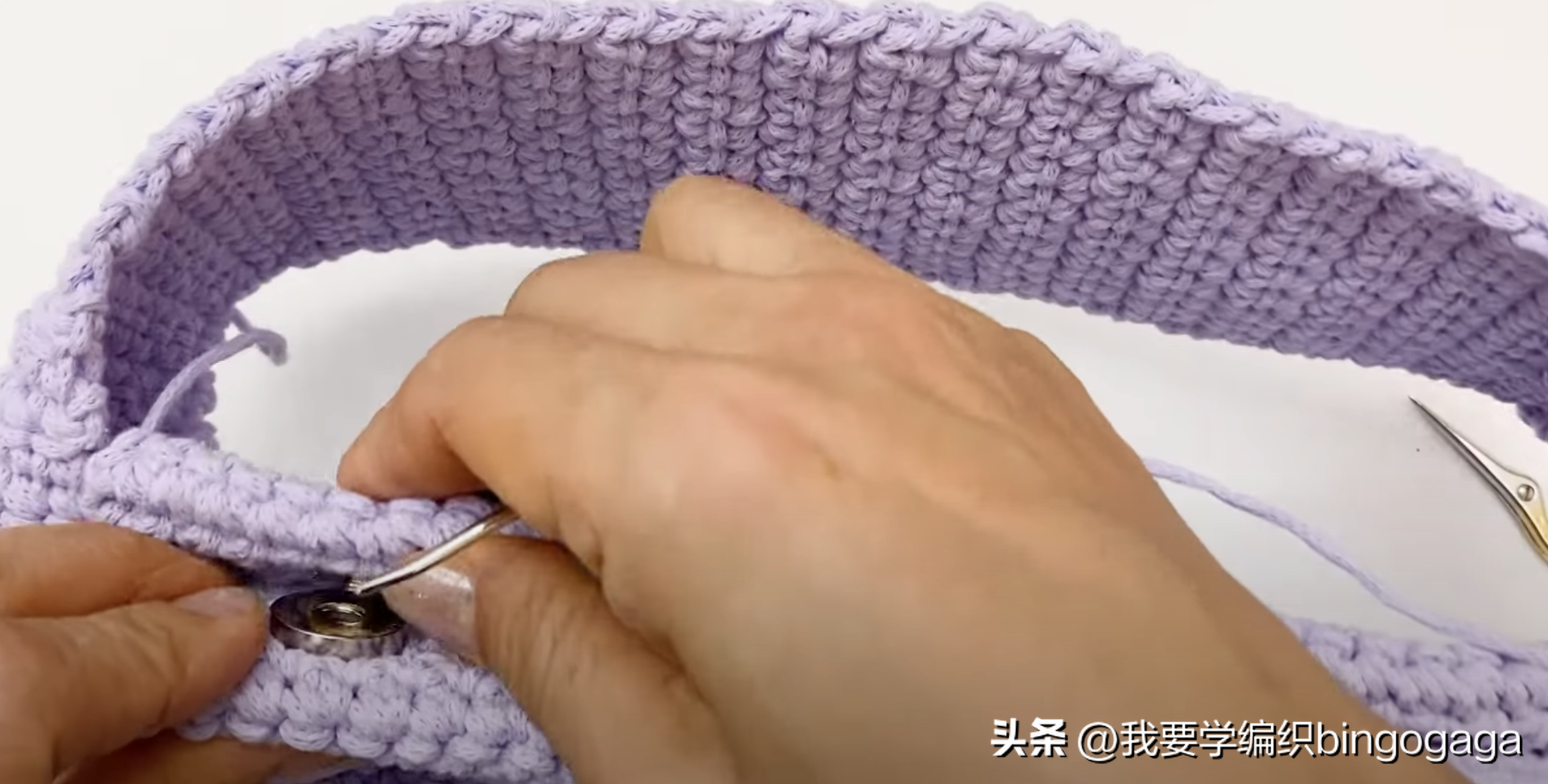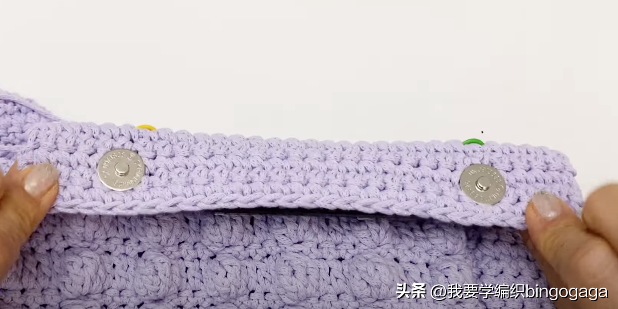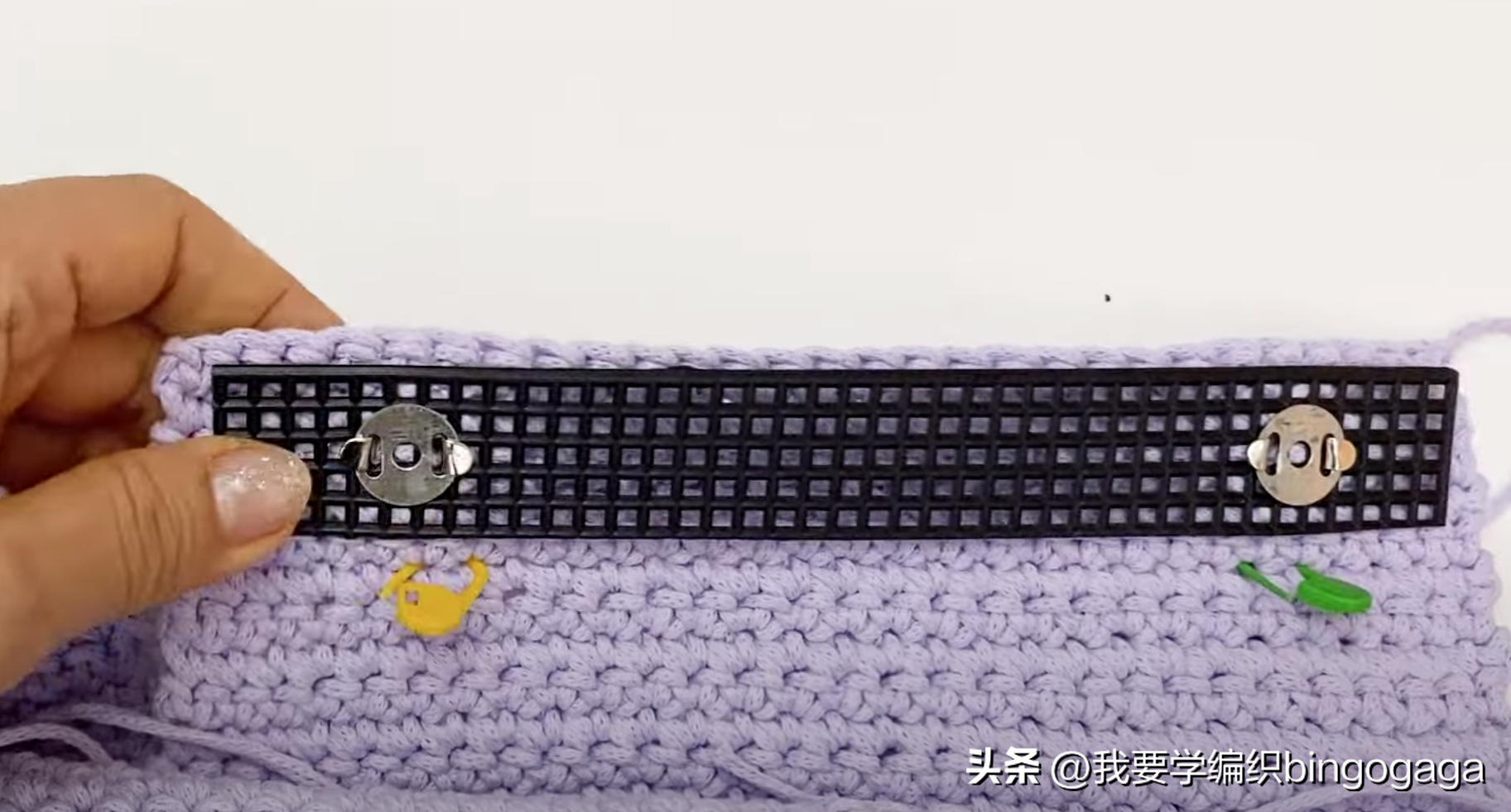 接着用记号扣将包底的边与钩带29行处固定好,再将包的两个侧边分别与19行处固定好(固定到短针边部分的下方),然后我们开始用钩针钩短针来缝合,我们以钩带为基础,去逐行穿针钩短针,先从侧边钩起,共钩了19针短针,转角的地方我们钩2针短针,再钩包底处28针短针,转角处钩2短,再到侧边又是19针短针(一圈的针数共为:19*2+28+4=70针);另一边也按同样的方法去缝合拼接。