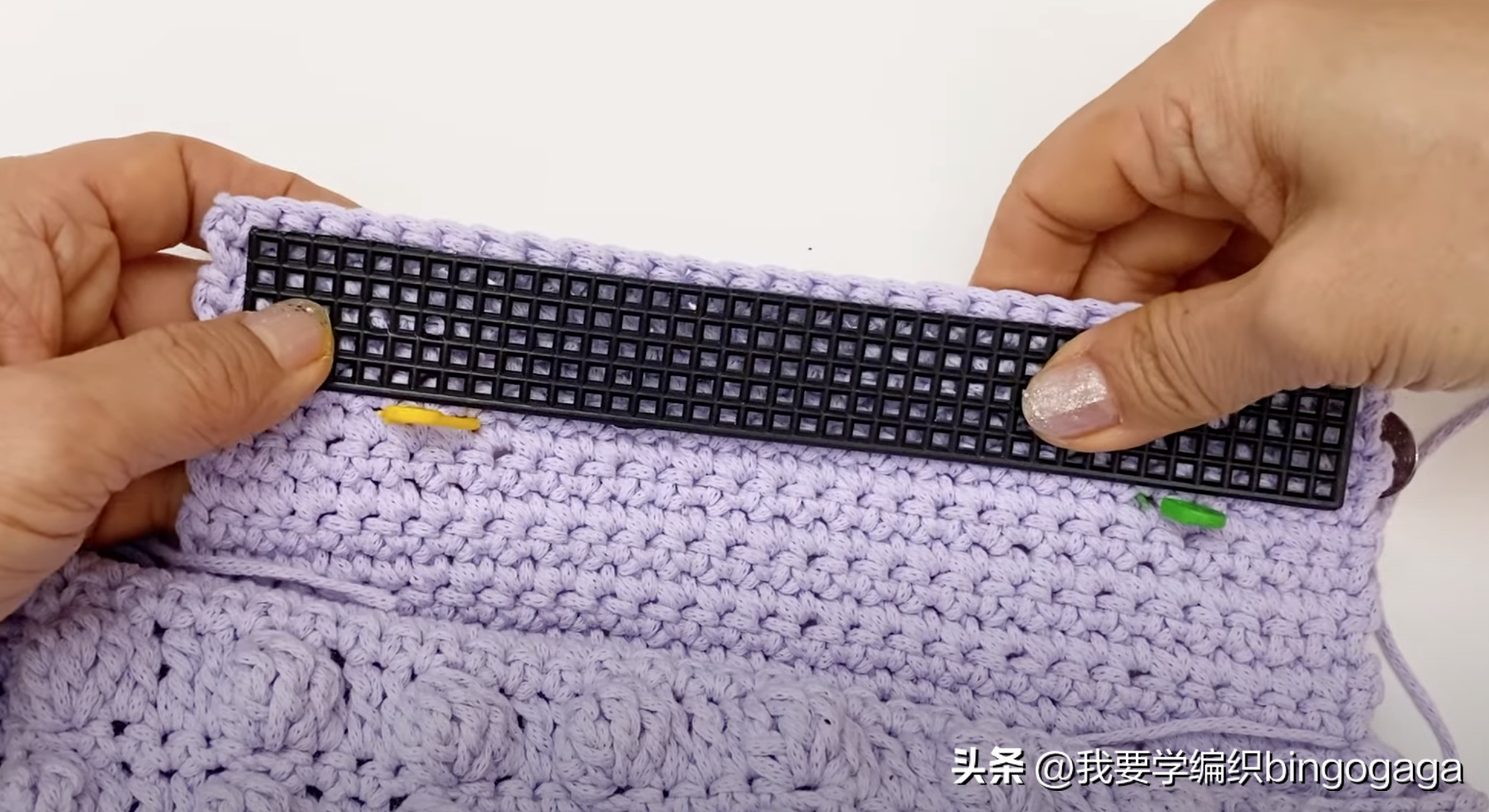 接下去用尺量出包包侧边(上面短针部分不算在内)及底边部分的长度(总长约50厘米),然后我们在钩带上也对应加上记号扣,从钩带的底边处开始,先向后数出19行(侧边),加上记号扣,再向后数出29行(底边),加上记号扣,再向后数出19行(侧边),加上记号扣,剩下的部分就是分配给手柄的。