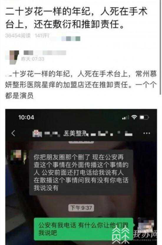 当天江苏广电常州中心站记者来到常州慕妍整形医院,发现这家美容整形机构玻璃门已关闭并锁住。但是门口的取外卖处仍有未取走的外卖,点餐时间为当天下午,送餐地址正是“慕妍医疗整形”。证明这家美容机构仍然有工作人员,随后记者拨打了前台的电话,前台有工作人员接听,她表示自己是新来工作的,一人在前台,也不了解此事。这位前台工作人员表示,最近很多人打电话询问这件事,但是她表示“21岁女孩整形死亡事件”是谣言,当记者还想进一步了解后对方直接挂断了电话。