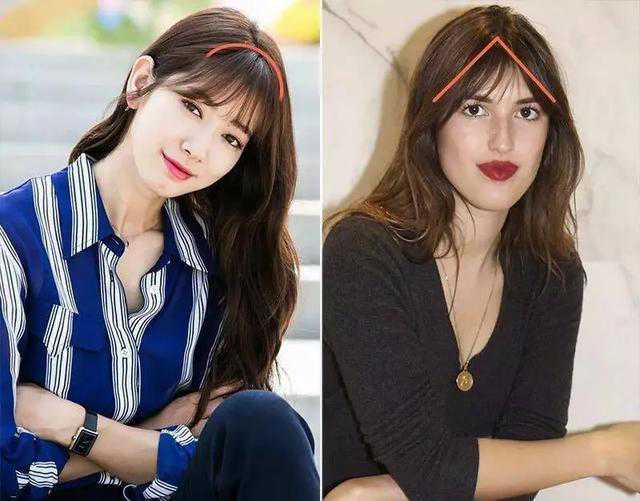 【法式刘海】:法式刘海比空气刘海更加厚重一些,但不像空气刘海那样整齐均匀,有长有短,而弧度也更自然。法式刘海与空气刘海的起点形状也不一样,空气刘海呈圆弧形,法式刘海成三角形。