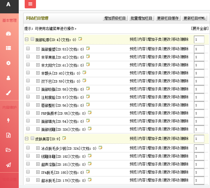 下面是后台展示,怎么样,项目多吧,鉴于篇幅有限图片我还没有截全,实际上每个站都有数百个项目,这些项目都是有内容的哦,拿去就可以直接使用了,选中一个项目之后,您直接点右侧的更改链接就可以编辑了。