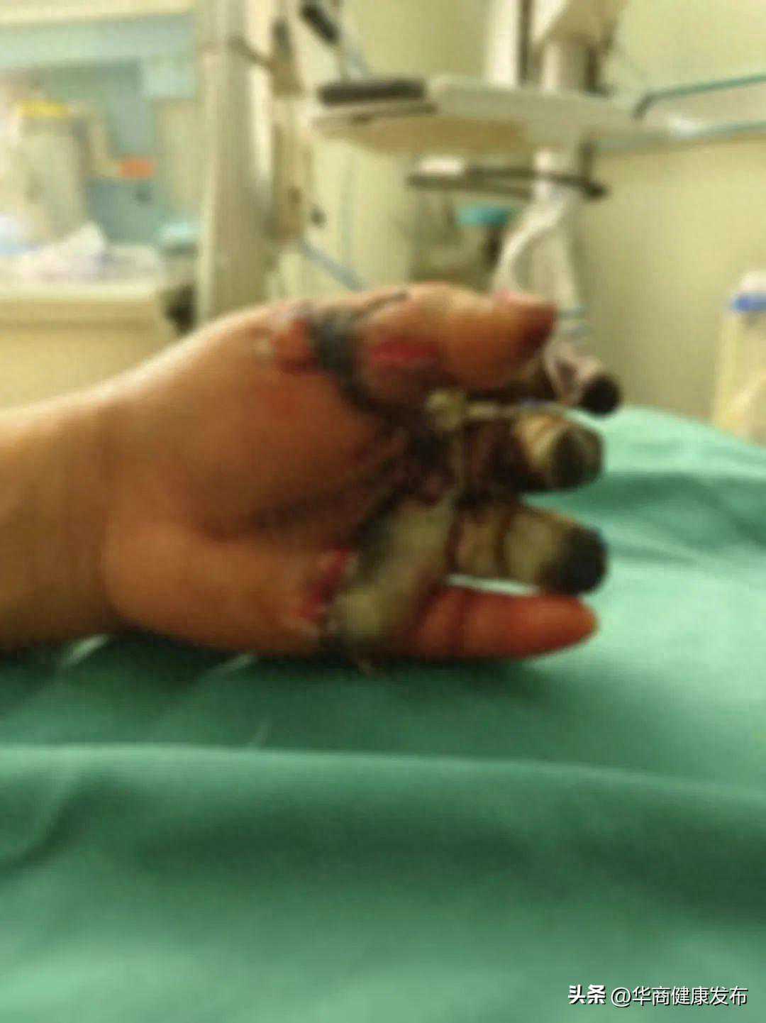 一位38岁女士,在家干农活时,不慎被电动玉米剥皮机绞伤左手,致其左手掌、手指毁损严重,伤后前往当地医院急诊手术吻合修复毁损的断指,但因受伤严重,术后左手第2、3、4指逐渐出现发黑、坏死并大量脓性渗出,残留的拇指和小指也岌岌可危、面临坏死风险。