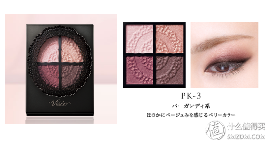 Visee是KOSE旗下的彩妆品牌,日系开架彩妆中的战斗机之一。这盘PK03从上市就受到热捧,综合了可打底可单用的浅粉色、金棕色,和可做晕染的深邃的酒红色和深棕色,恰好迎合了这两年大热的酒红色系妆容。单用金棕色可打造自然的裸妆效果,珠光质感综合使用起来可以勾勒深邃的眼部轮廓。这个系列的PK02也属于热门的桃花妆色系,相较于PK03,PK02的配色更粉嫩活泼一些,比较适合学生党使用,PK03则更适合职场女性使用,端庄优雅。不过粉质略粗,会有飞粉现象,胜在上色度佳,所以在上深色的时候要小心下手,取粉少量多次,做好晕染就能成功大半。对于百元以内的价位来说,也是值得入手,较为常用的一盘。
