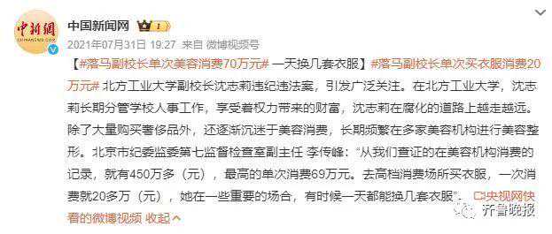 北京市纪委监委工作人员称,查证的沈志莉在美容机构消费的记录就有450万多元,最高的单次消费69万元。她去高档消费场所买衣服,一次消费就20多万,她在一些重要的场合,有时候一天都能换几套衣服。