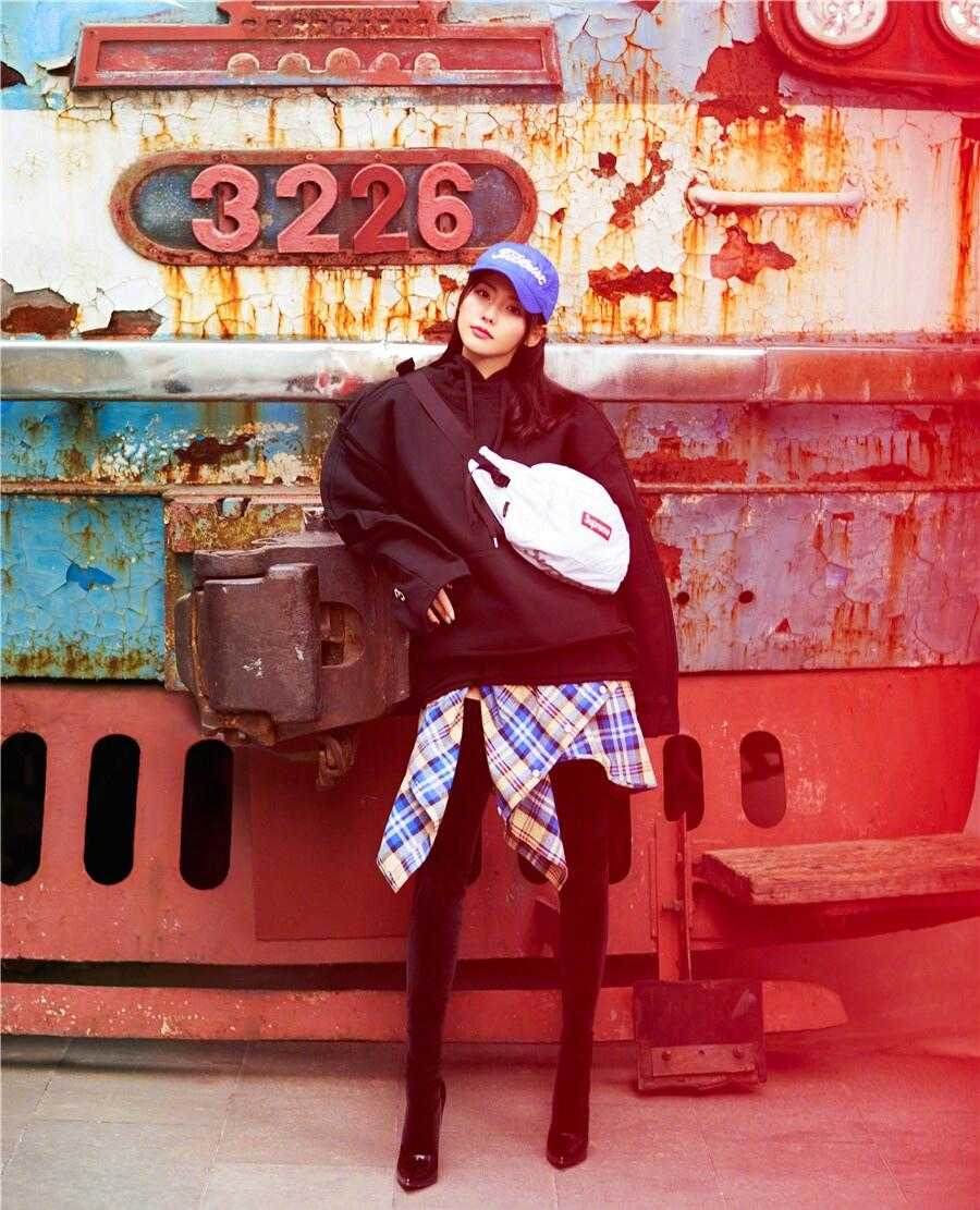 宽松款式的黑色卫衣给身体提供了舒适感,大家在进行秋冬穿搭的时候考虑一下版型的问题,碰到天气偏冷的时候也方便在内里增添许多衣物,在胸口位置加入了很多白色的印花字母图案,使用黑白配色再次突出了设计感。下身则是一条直筒型的牛仔裤,利用平直的线条来勾勒出双腿线条,配合小白鞋使用更显休闲风格,她将秀发披散了下来,配合棒球帽使用,看起来真的超酷的!