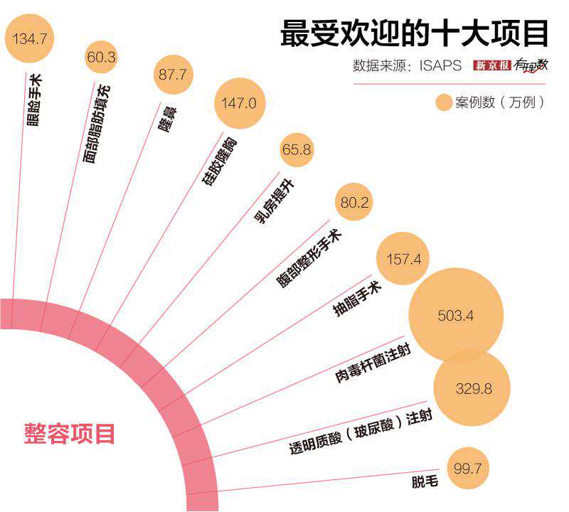 在这之外,抽脂手术、硅胶隆胸、眼睑手术也依旧受人青睐,2017年均有超过百万例手术实施。
