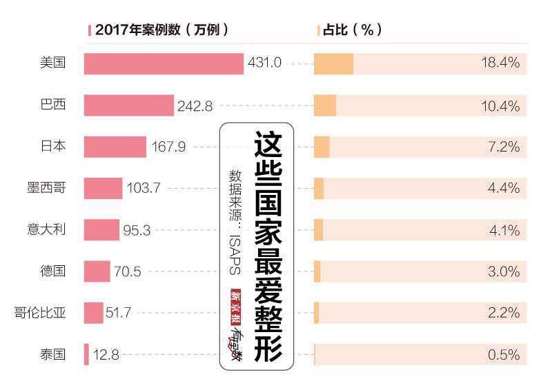 国际美容整形外科协会(IMCAS)报告还显示,美国、巴西、日本、墨西哥、意大利、德国、哥伦比亚、泰国,这八个国家整形项目的案例数占到全球总数的50.2%。但这并不意味着整形在这些国家最为普遍,因为一旦计算人均数字,排行榜会发生很大变化。