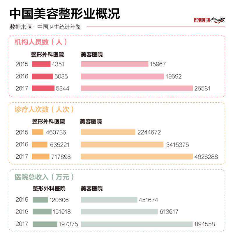 翻看历年的《中国卫生统计年鉴》可以发现,这几年中国人对形象改造更加执着了。2017年一年内,中国的整形外科医院诊疗人次就已超过70万,美容医院诊疗人次更是在460万以上。还有很多案例,并未纳入统计中。