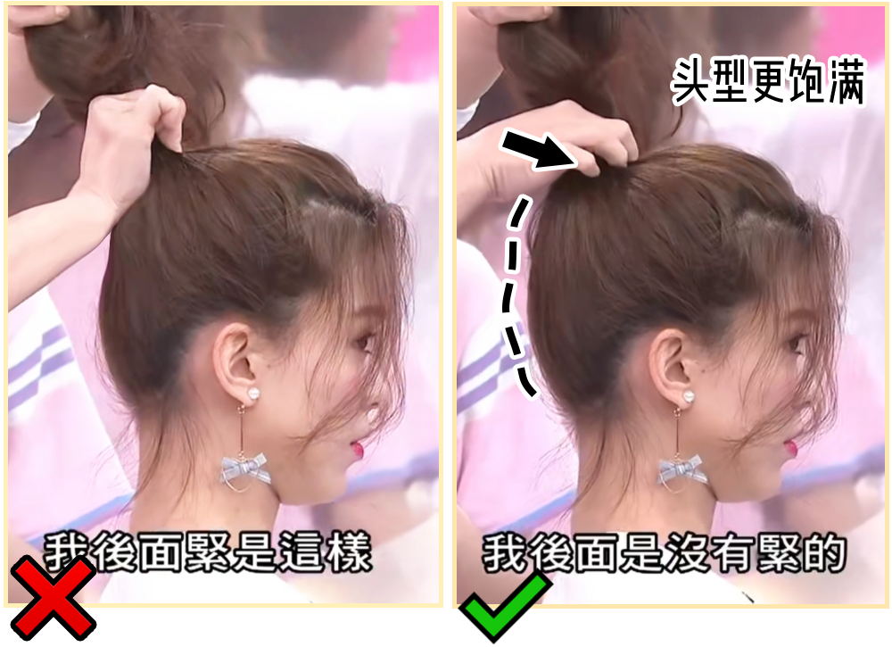 接着扎上去时不要拉紧头脑勺,微微松开,这样的头型更加饱满。对比看看这令人酸唧唧的发量,不用再担心年少秃头!