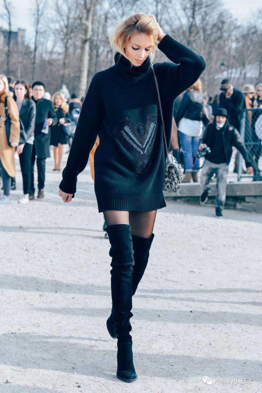 同样的中长款毛衣还有高领的,如果不想太高调黑色的毛衣下面还是搭配普通黑色的过膝靴,这种穿搭简单易学永不出错。