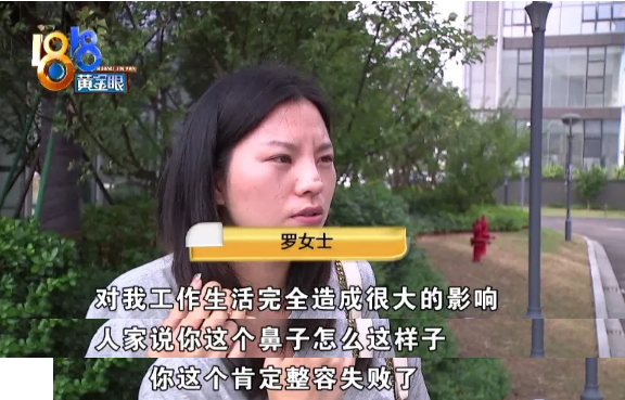 罗女士:“对我工作生活完全造成很大的影响,我出去玩的时候,人家说你这个鼻子怎么这样子,我跟人家说我做了微整手术,做了隆鼻手术,人家说你隆鼻怎么隆得上面有疤的,人家的疤不是都在里面吗,你这个怎么上面还有,你这个肯定整容失败了,我就感觉自己真的是活不下去了,真的感觉好委屈啊。”