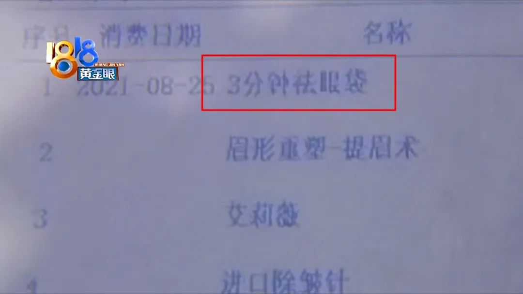 消费单的第一个项目名叫“三分钟祛眼袋”,标价4000元。周女士说,其他项目,她觉得都达到了自己想要的效果,唯独这个项目,三分钟之后没达到效果。