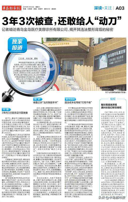 对于青岛金岛医疗美容诊所有限公司反复违法、被查一事,青岛市卫健委综合监督执法局工作人员告诉记者,因未取得《医疗机构执业许可证》,该公司擅自做医疗美容肯定是违法,但是由于该公司还有经营其他业务的资质,包括生活美容的资质,因此卫生执法部门只能责令该公司停止从事医疗美容,而无法令其关门。而在经营其他业务时,该公司则会“打游击”式做医疗整形美容。“我们在执法时,这家公司的人解释说,他们在办理《医疗机构执业许可证》,但是因周边有餐饮单位,所以没有办下来。”市南区卫生计生综合监督执法局工作人员告诉记者,这家公司也是执法部门监督的重点对象。