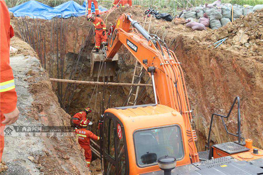 7月12日12时许,百色市百东新区百色大道和百祥路交叉路口旁一在建基坑工地发生塌方事故,4名施工人员被埋,情况十分危急。接到报警后,百色市消防救援支队指挥中心立即调派7辆消防车45名消防指战员赶赴救援。据了解,现场为一高压输电线塔的基坑(坑约10米深、2米长、2米宽)施工现场,4名工人正在基坑内进行钢筋捆绑作业时不料基坑突然塌方导致掩埋被困,其中1名工人在事故发生后20多分钟被现场其他工友及时救出,仍有3名工人被埋坑内。截至当日23时18分,三名被埋压的施工人员已被全部找到,但均不幸身亡。目前,事故后续处理及善后工作正由有关部门有序开展当中。图为救援现场。通讯员石远波田辉供图(广西新闻网)