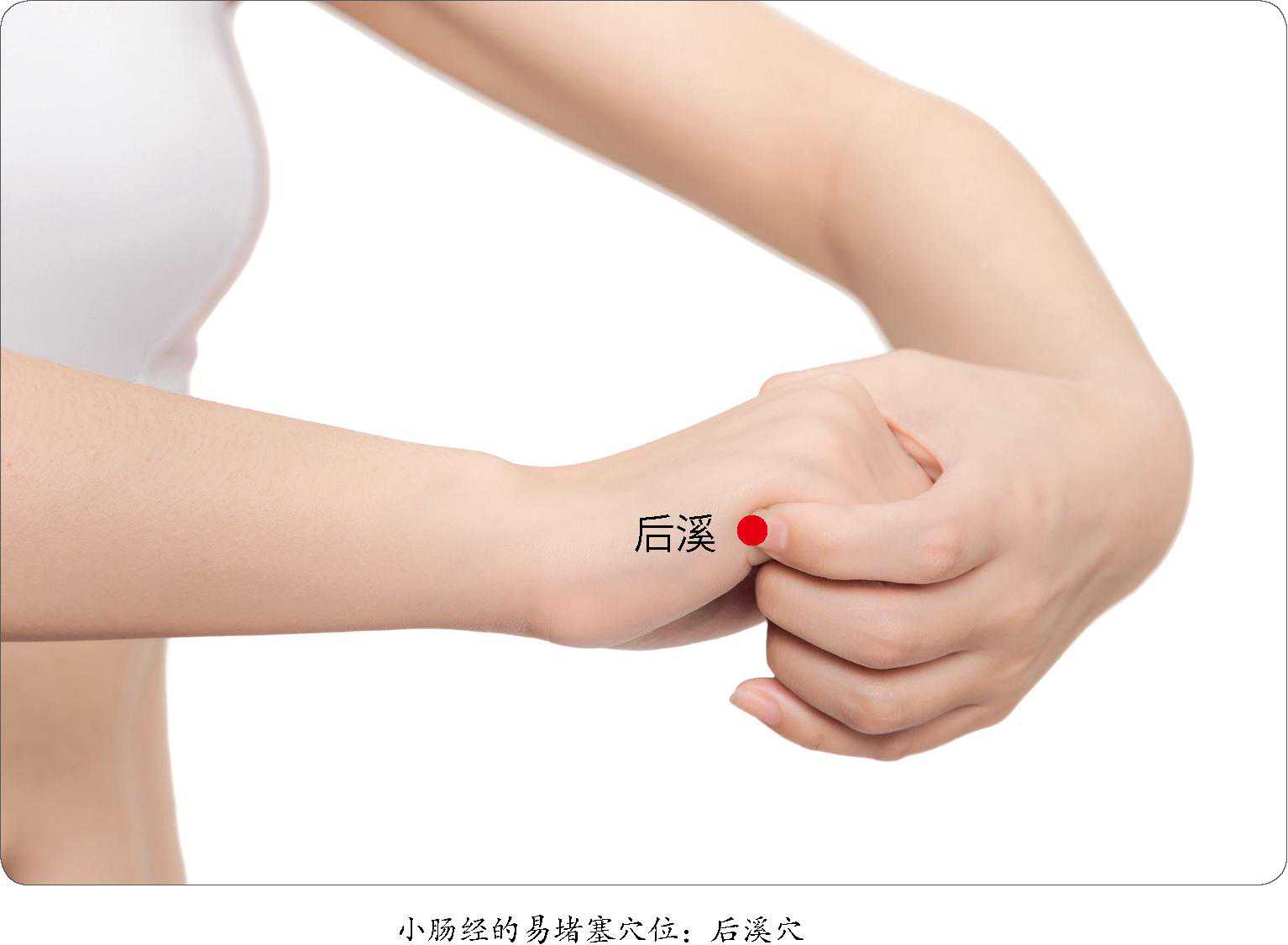后溪穴位于小指掌指关节后,掌横纹头赤白肉际处。用另一手食指点揉,如果没有痛感,说明气血堵在上面。将天宗穴和肩贞穴管理好,后溪穴自会得气。