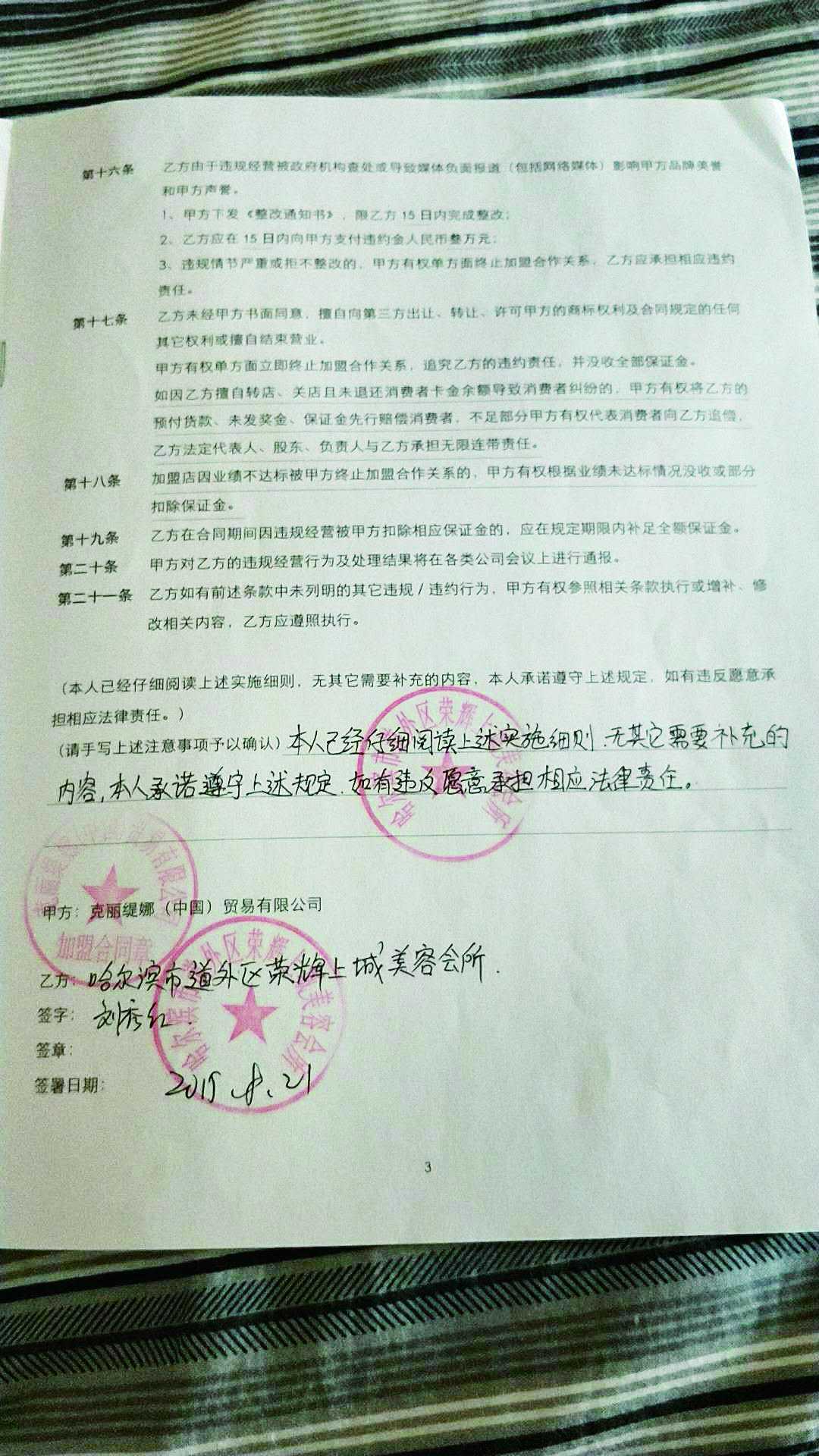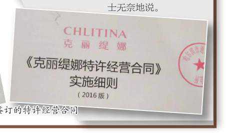 记者在这份名为《克丽缇娜特许经营合同实施细则(2016版)》的合同上看到,第十七条明确写着,