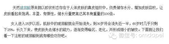 是一种广发存在于人体皮肤组织中的物种,缩水性很强,对皮肤有一定的支撑饱满作用。人工合成的玻尿酸与人体组织玻尿酸很接近,几乎没有不良反应。主要用于皮肤软组织填充塑形,比如最常用于鼻唇沟填充、面部凹陷填充、粗大皱纹填充、还有,可以用于隆鼻、隆下巴、丰唇等等。是目前非手术注射美容应用最广泛的材料之一。