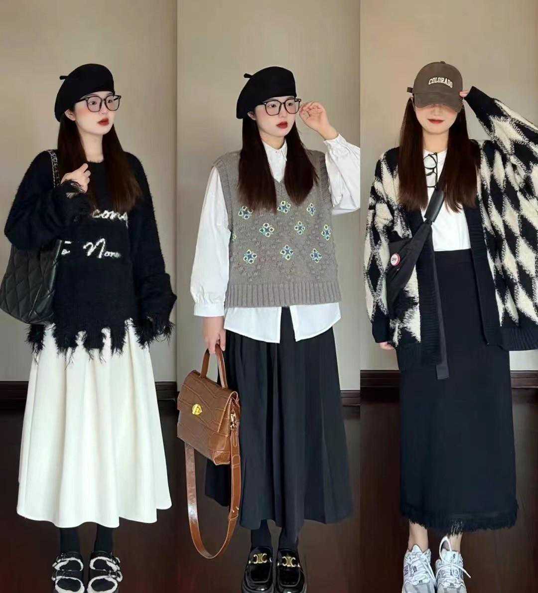 一件长款过膝的灰色百褶半身裙,搭配白色的衬衫和灰色可爱系的毛衣马甲,穿出学院风,冬季的内搭这样穿,可爱极了,无论外搭羽绒服还是大衣都是极为好看的!