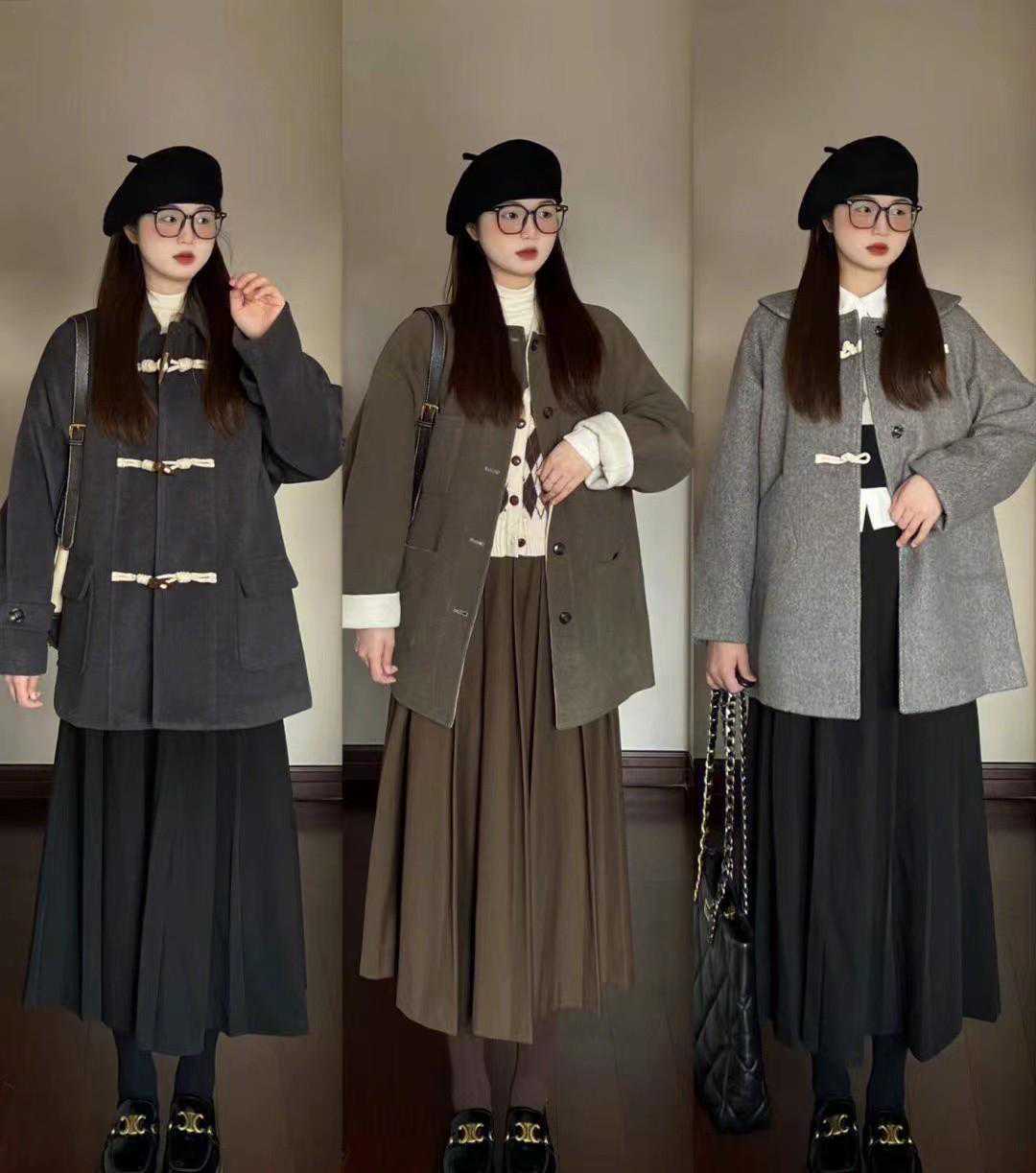 半身裙除了可以和长款大衣搭配,也能够和短款大衣搭配出不一样的风格。深灰色的中长款呢子大衣简单而又简约,带有牛角扣的设计,让衣服本身多了几分古典美,让一种青春感扑面而来。