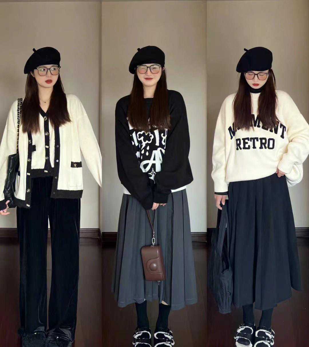 黑色的简约毛衣衬得女生的更加可爱动人,搭配一件灰色的半身长裙,遮肉显瘦,就算是胖胖的女孩子也可以学会这样穿。宽松的裙摆修饰了腿型,穿搭也能够让女孩子变得更加自信。
