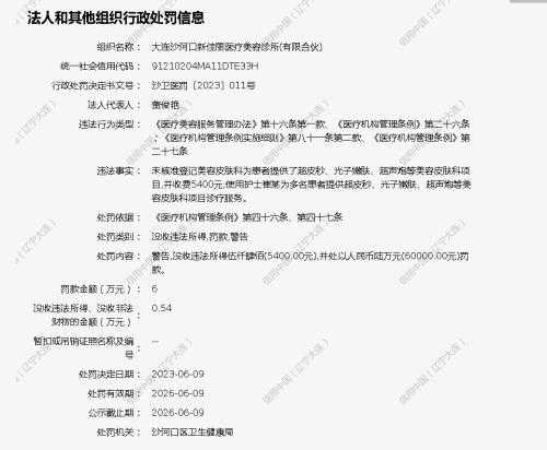 根据信用中国网站近期发布的信息显示:大连沙河口新佳丽医疗美容诊所被大连沙河口区卫生健康局行政处罚,行政处罚决定书文号沙卫医罚﹝2023﹞011号。