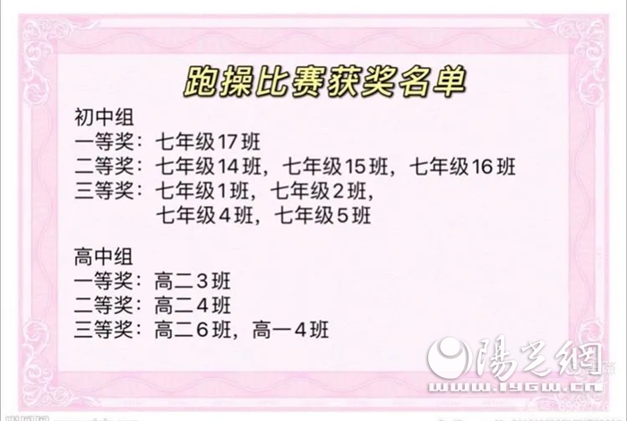 本次跑操比赛在全校师生共同努力下,最终取得了圆满成功。4月12日升旗仪式上,学校领导为获奖班级进行了颁奖。本次获奖班级众多,学生们收获满满。