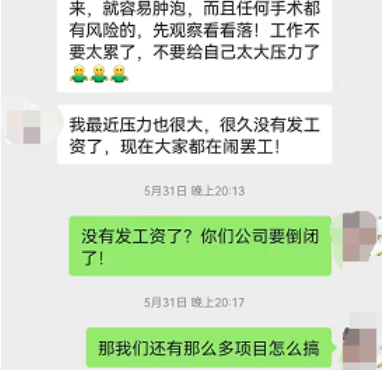 5月31日,蓝女士在微信上与之前介绍自己去该医院的人交流美容事宜,对方称,该医院工作人员已经两个月没有发放工资。蓝女士询问“公司是不是要倒闭了”,对方回复“这么大一个机构应该不会吧”。蓝女士提出端午节去该医院做美容,但对方称医院在此期间放假。
