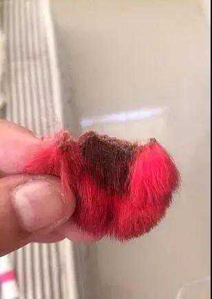 于是,美容所用红色染料,盖住了狗狗的耳朵和尾巴,并用铝箔包裹了40分钟,最终染成了红色。
