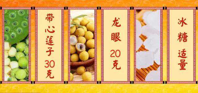 做法:带心莲子30克、龙眼20克,冰糖适量煮汤即可。