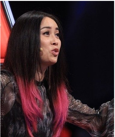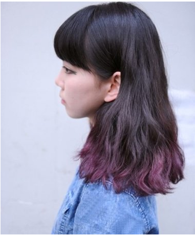 将发尾的头发做成深紫色的染发,发根上的头发则是黑色的蓬松度的自然发丝。中长发烫发发型,有着简单的两个层次,齐刘海梳在眉头上,两边头发贴着耳尖拢到后边。