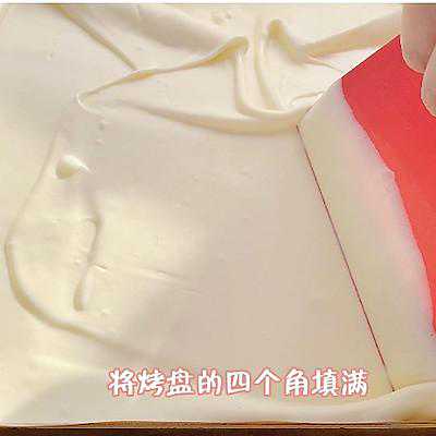 27、出炉后晾凉,将打发好的淡奶油在蛋糕坯表面抹平整