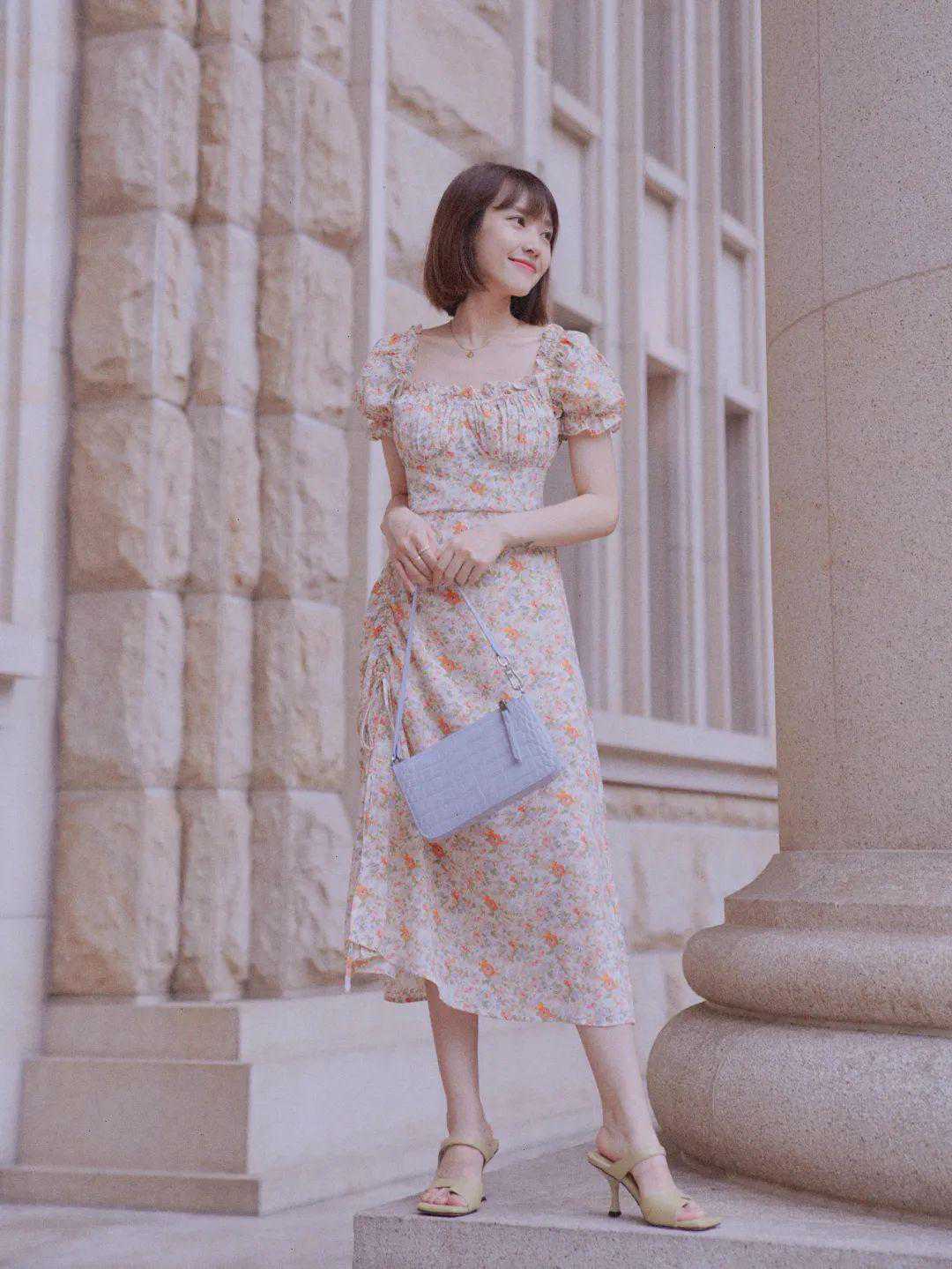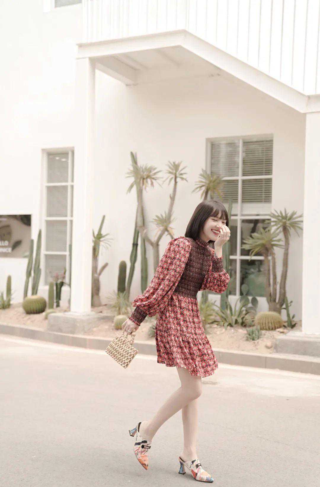 而且这条碎花连衣裙特别有“心机”!高腰线+大方领+开衩设计(这些不都是显高显脸小的设计吗?!)超适合有锁骨的小个子姐妹!
