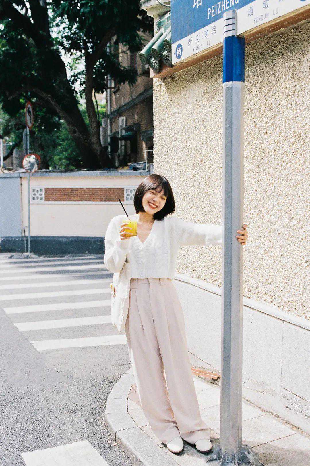 那像我们平时穿开衫就可以像米肥这样在里面搭一件浅色系或者同色系的T恤,最上面记得解开1-2颗扣子,不仅修饰了脖颈线条,还让这套穿搭更有层次感了呢~