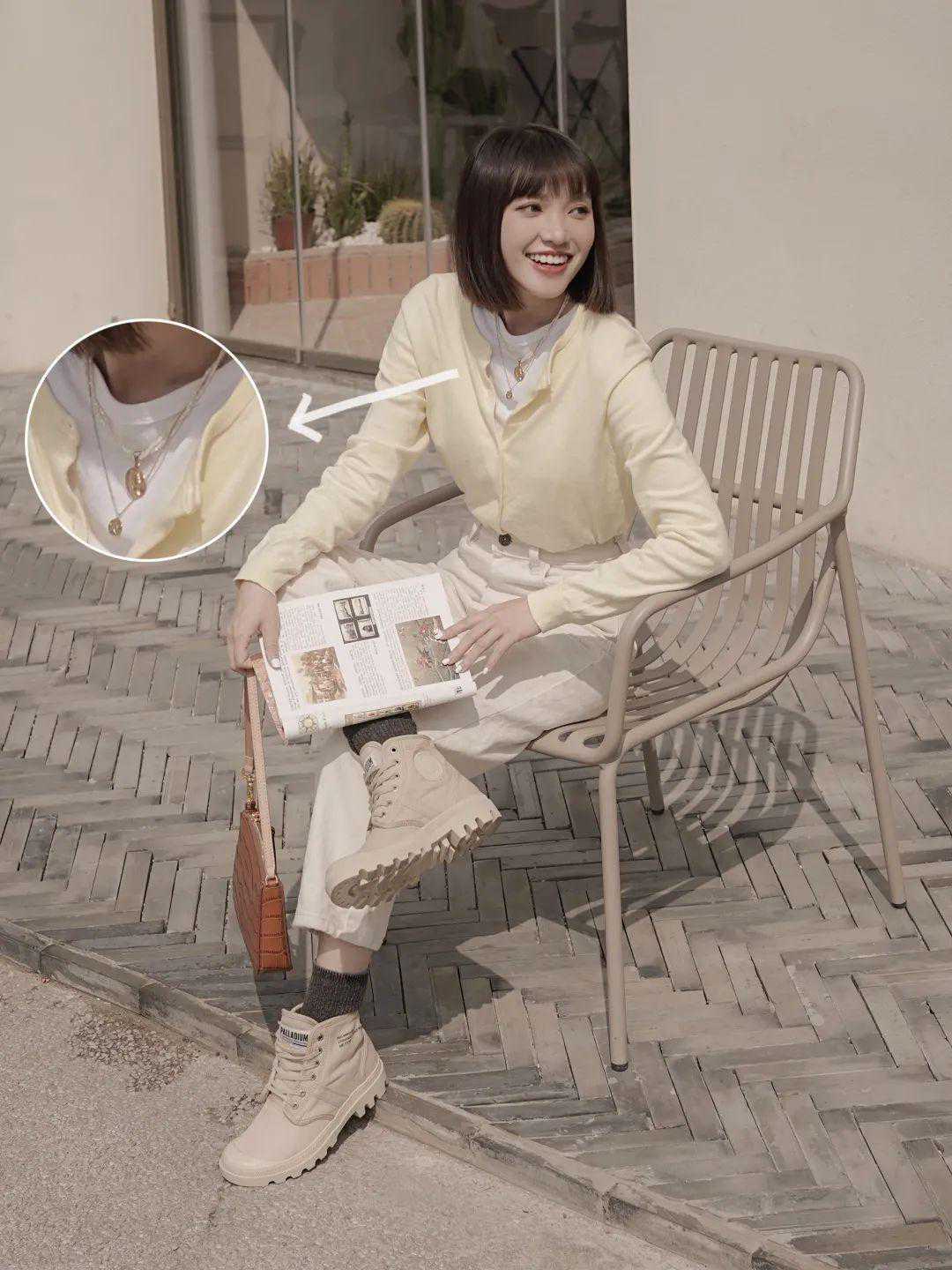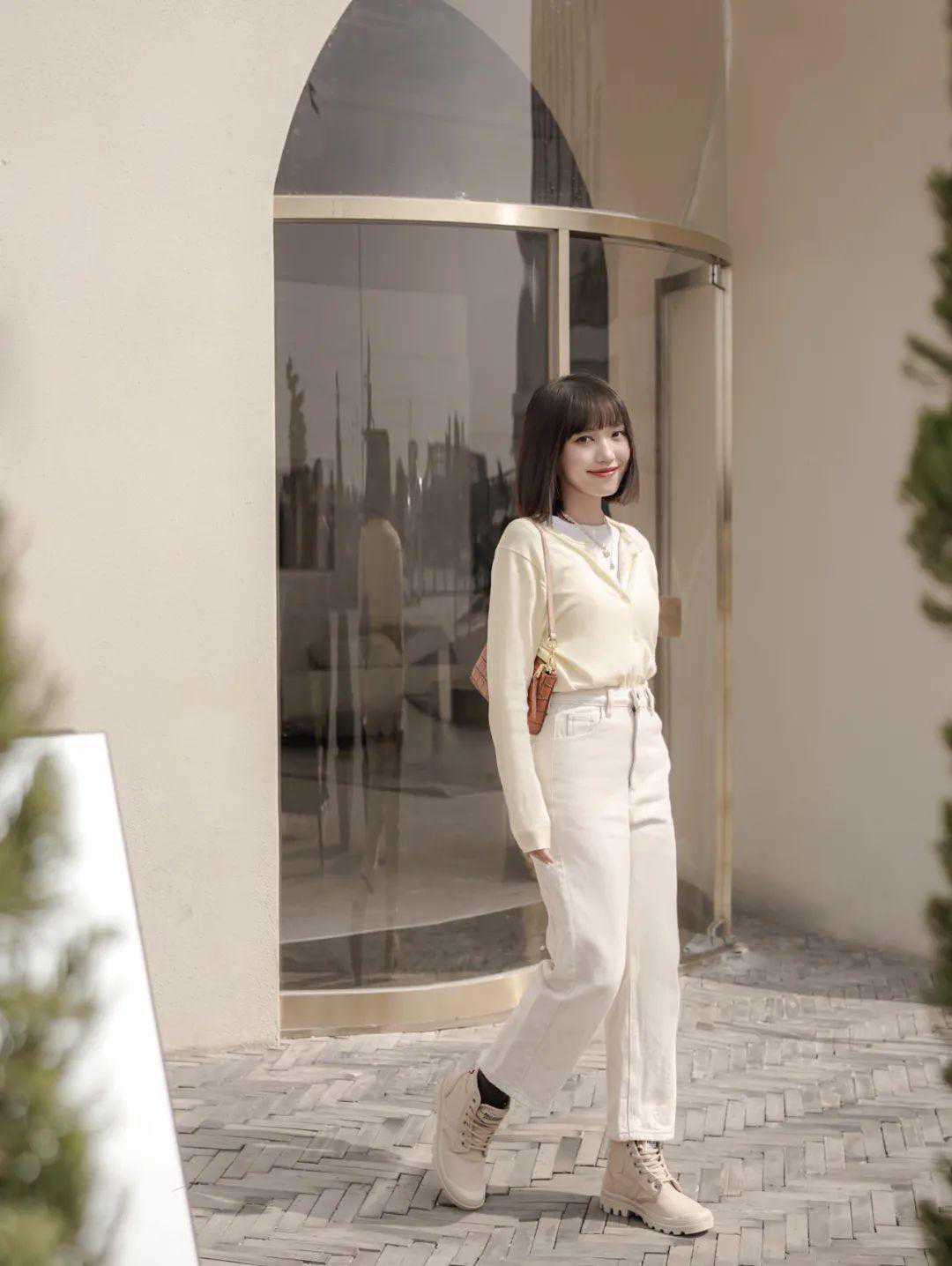 先看看米肥的这套浅黄色针织开衫+米白色直筒裤+杏色马丁靴,虽说整体是浅色系,但是上衣还是很马卡龙啊~(是春天的气息)