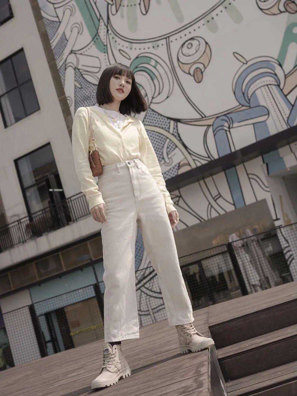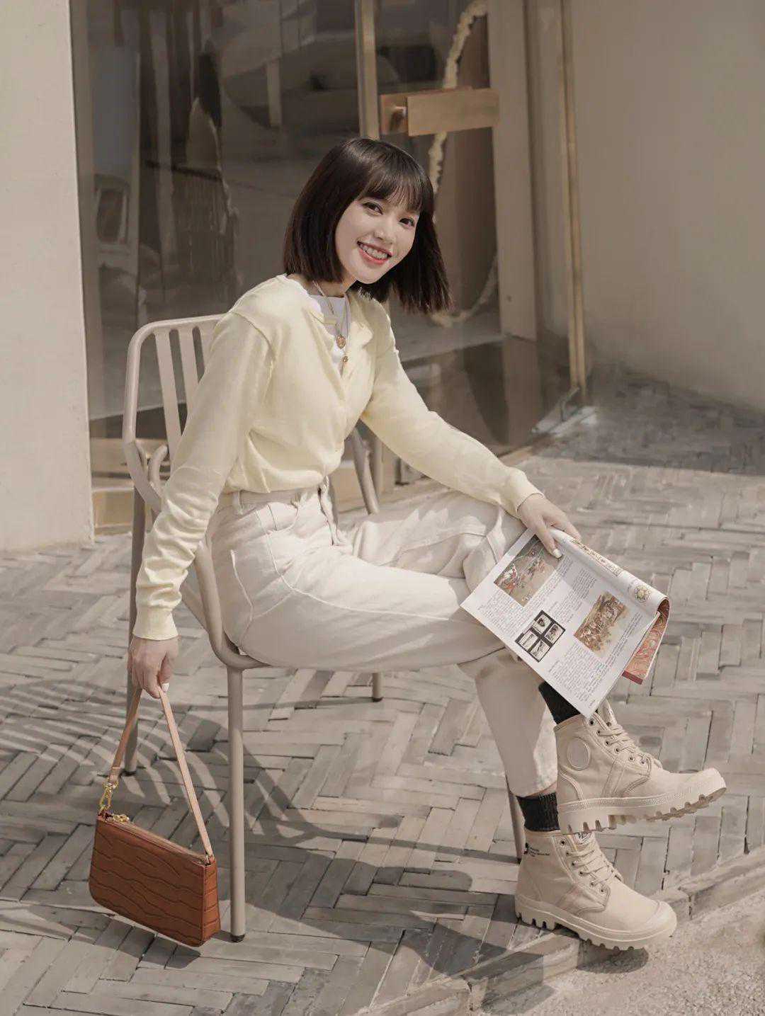 当然啦,鞋子部分也不能选太重的颜色,像米肥这样搭配一双同色系的杏色马丁靴,这种窄靴筒跟宽裤腿的对比,简直显瘦plus,而且看起来不也更清爽了吗~