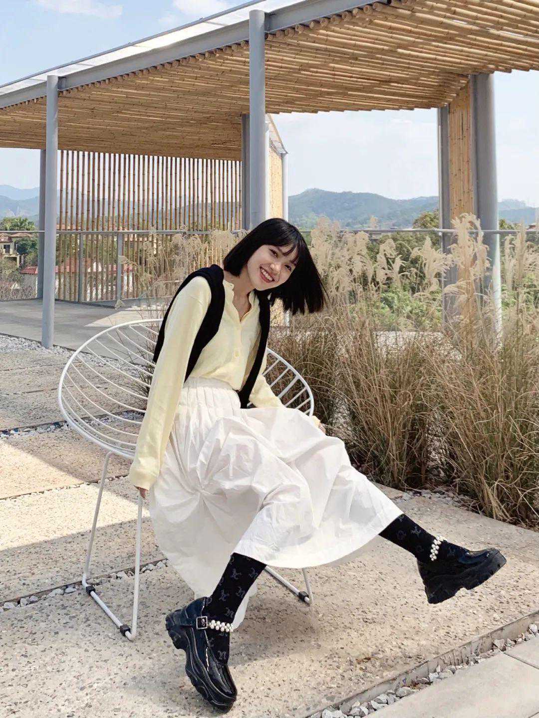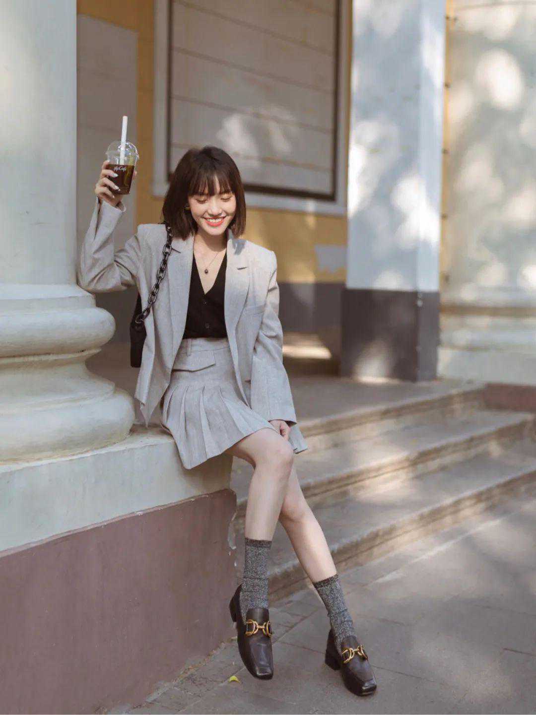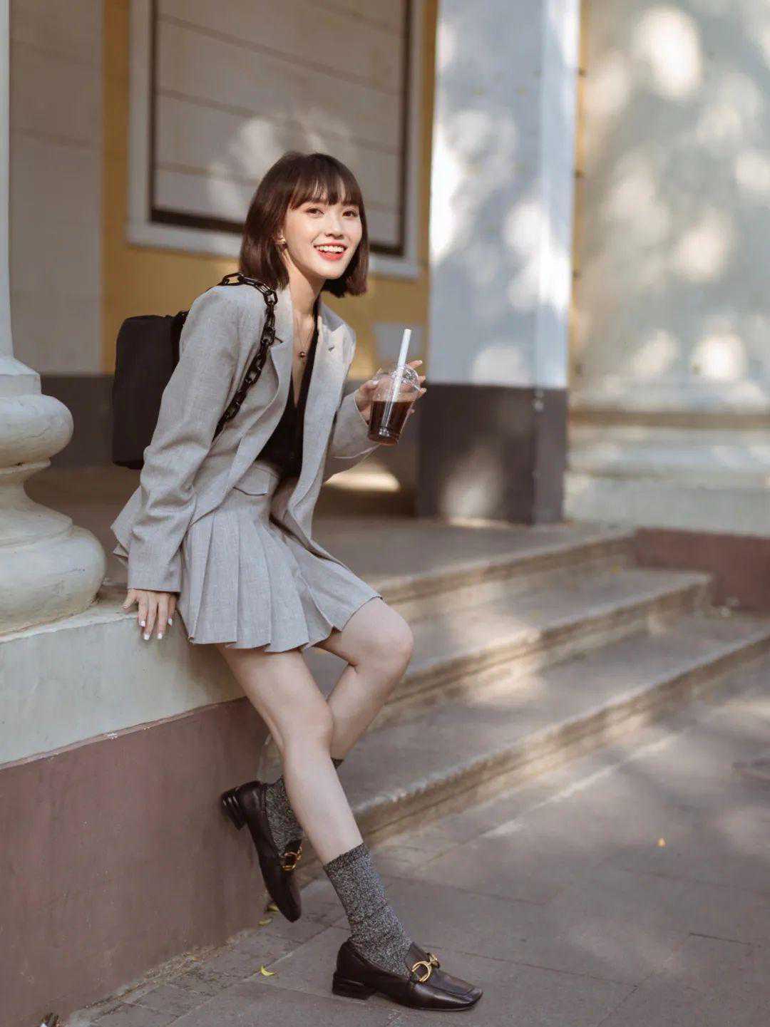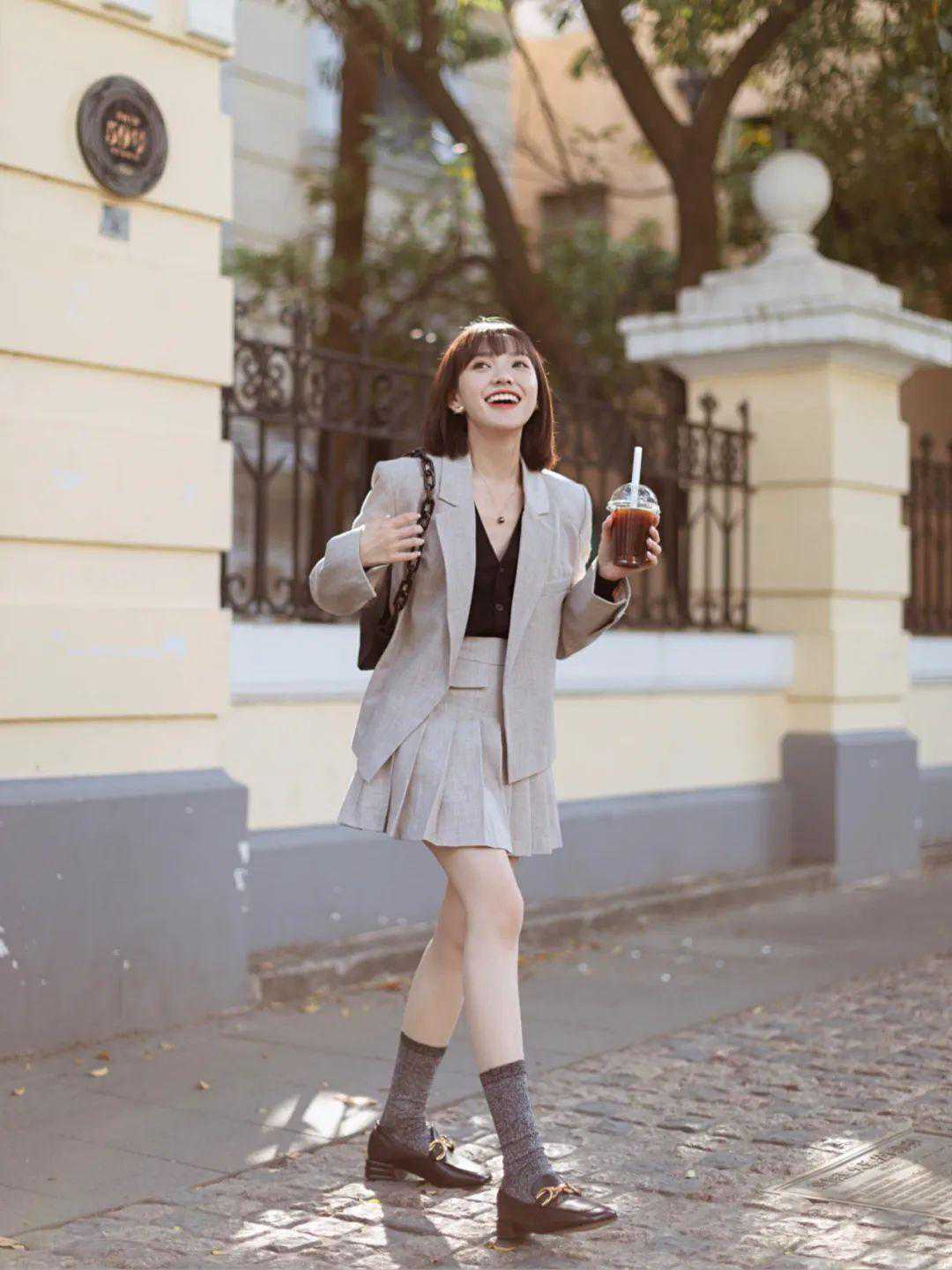 如果想要更加学院风一点,可以像米肥这样,搭配一双带点格纹的深色中筒袜,复古风轻松get~