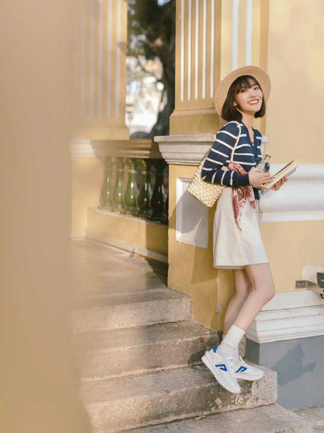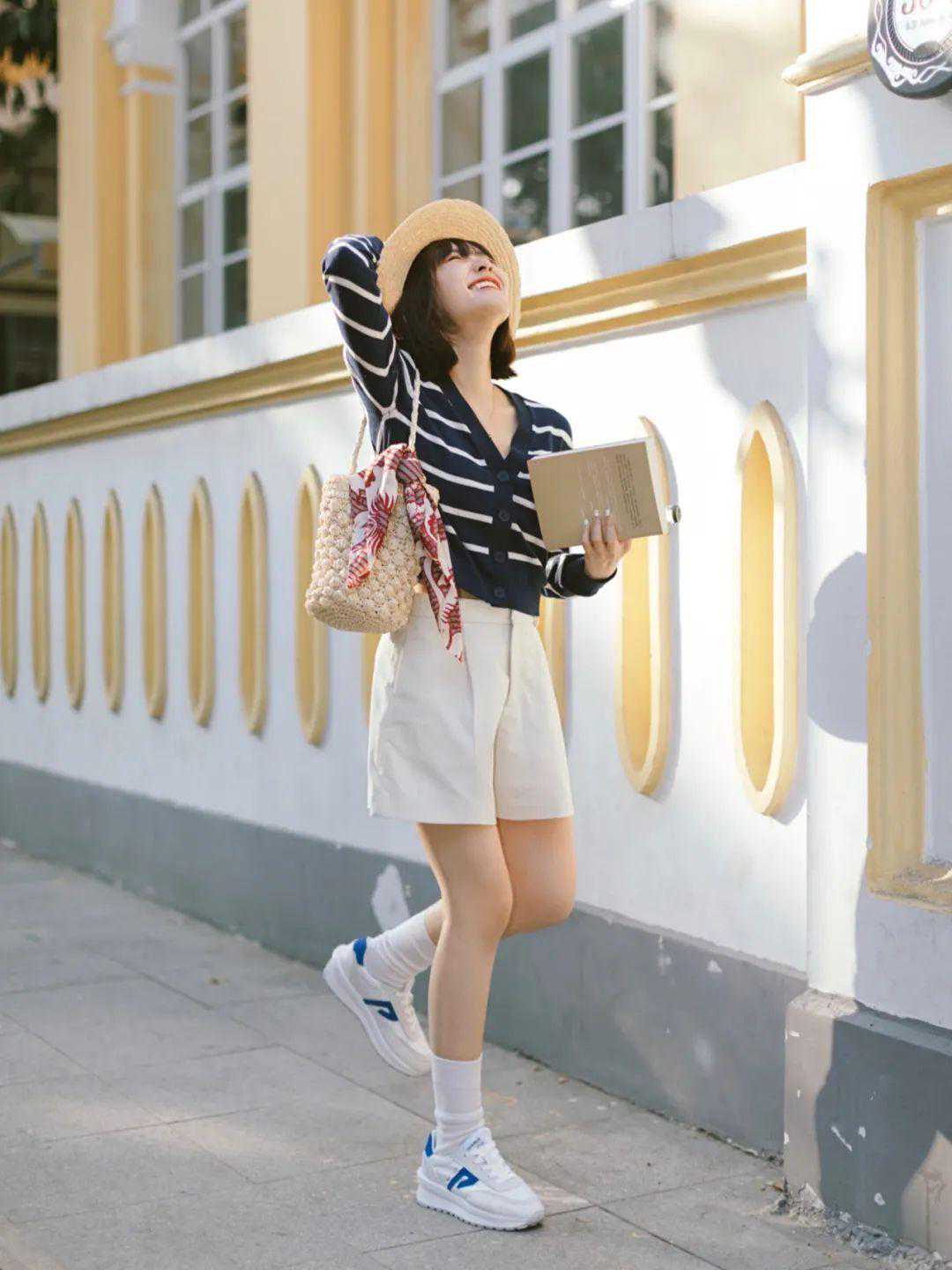如果觉得上两套的色彩比较暗,那可以瞧瞧这套海军风针织衫+高腰阔腿短裤+复古风格运动鞋,蓝白搭配的视觉冲击就感觉活力青春起来了~