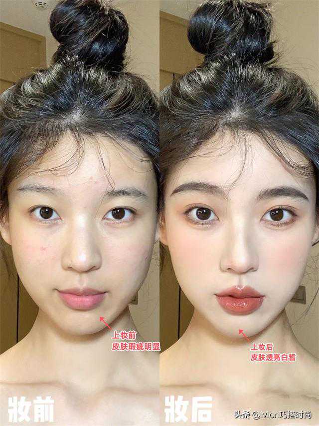 素颜和淡妆最明显的区别便是皮肤。可以看到,素颜皮肤会有明显暗沉、痘印、黑头等瑕疵,让皮肤显脏又疲惫。