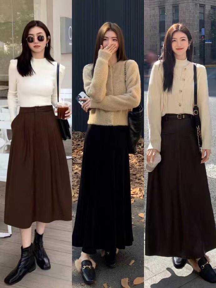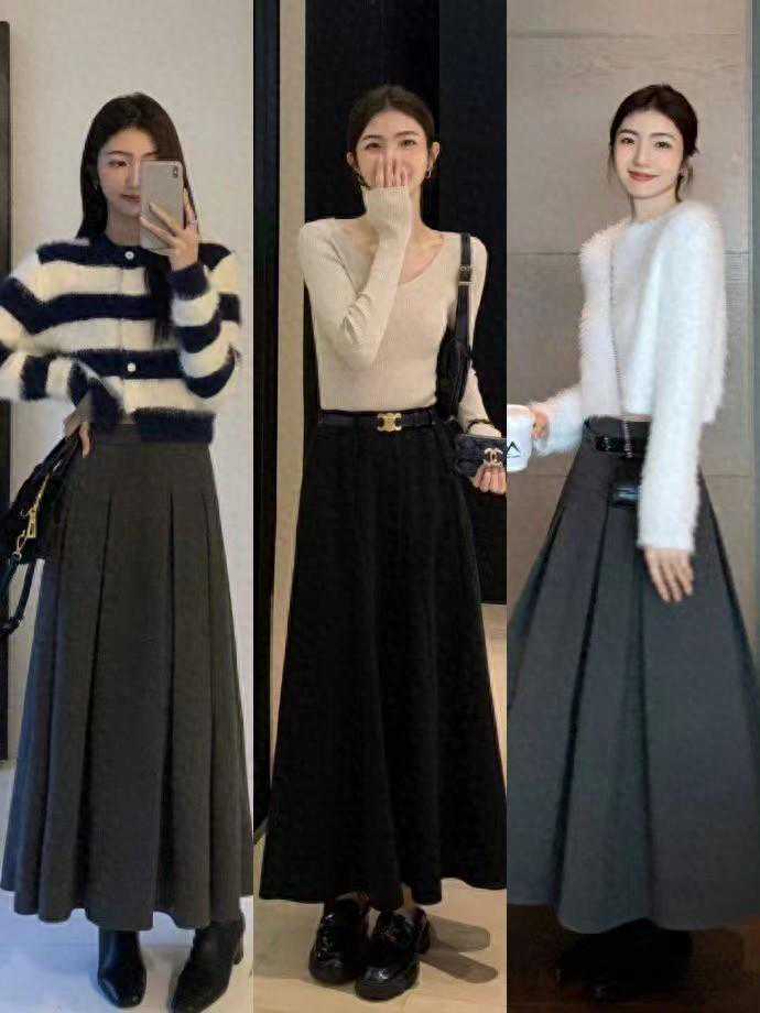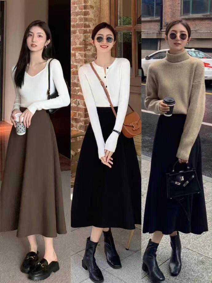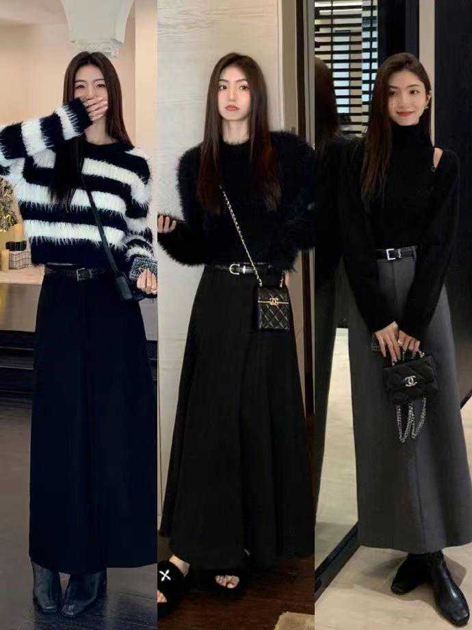 A字形版型的长裙也是很常见的裙子单品,秋冬季及搭配深色系的,黑色就是很百搭的一款,能够搭配大衣,也能够穿羽绒服,而且这种版型的裙子穿出的效果主打一个,显腰细,显腿瘦。