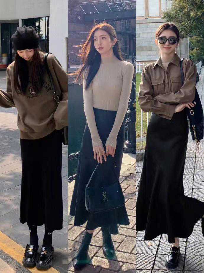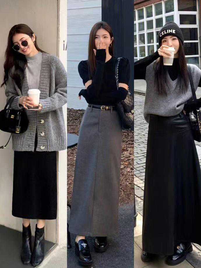 女生穿长款的直筒裙是非常有气质的,深色系不仅好搭配,而且很有冬天的氛围感,拍照也是很好看的,而且直筒裙适合不同身形和腿型的女孩子搭配。